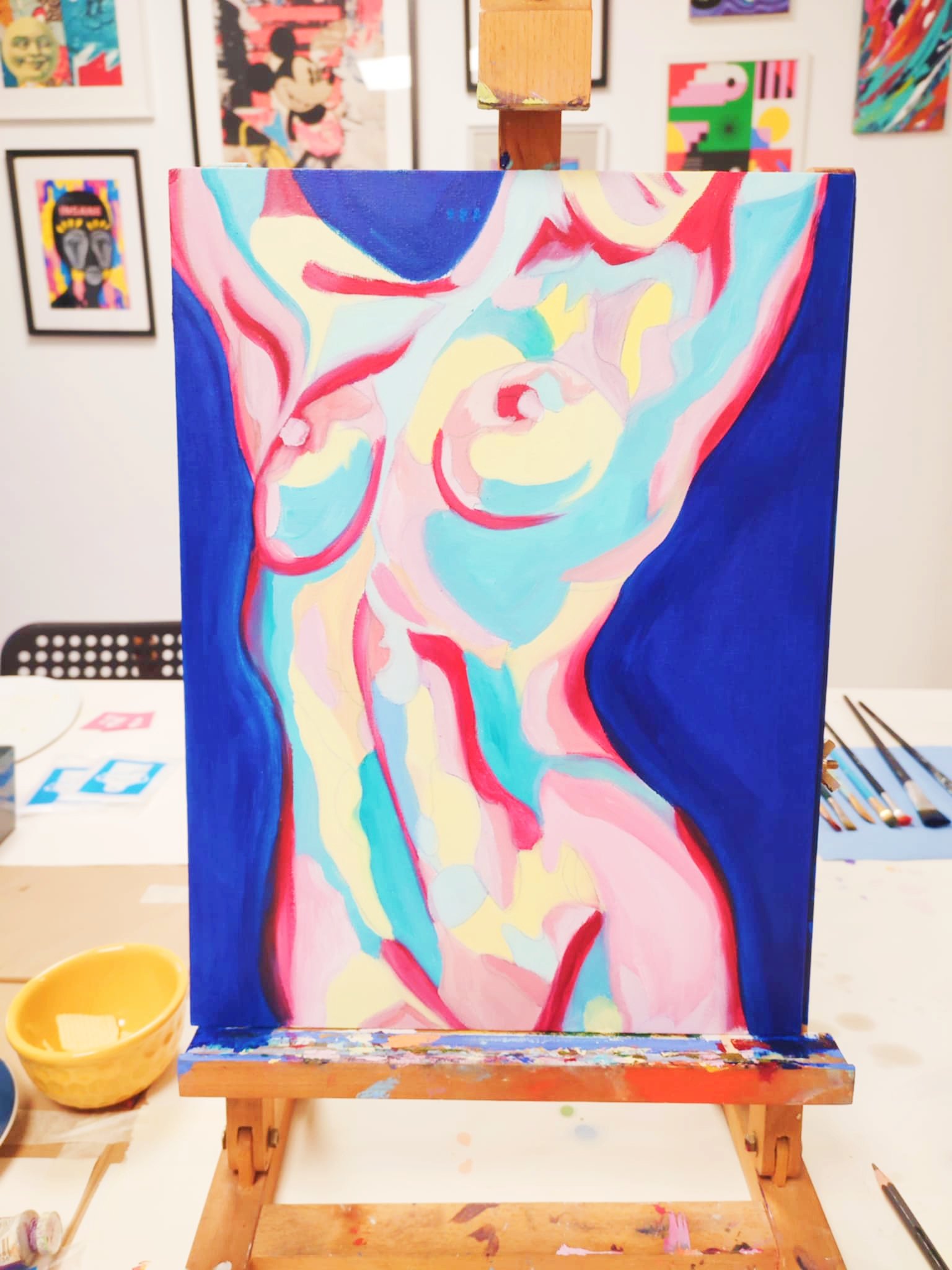 Começamos por trabalhar os fundamentos da pintura a óleo, abordando o comportamento do meio, como aplicar camadas de cor e como utilizar a textura intencionalmente e não acidentalmente. A partir daí, passas a construir a tua composição de nu abstrato, com o nosso artista a guiar-te em cada decisão e a ajudar-te a desenvolver a tua própria linguagem visual ao longo da sessão. O ambiente do estúdio é descontraído e sem pressas, concebido para fazer com que a experimentação seja natural e não pressionada.