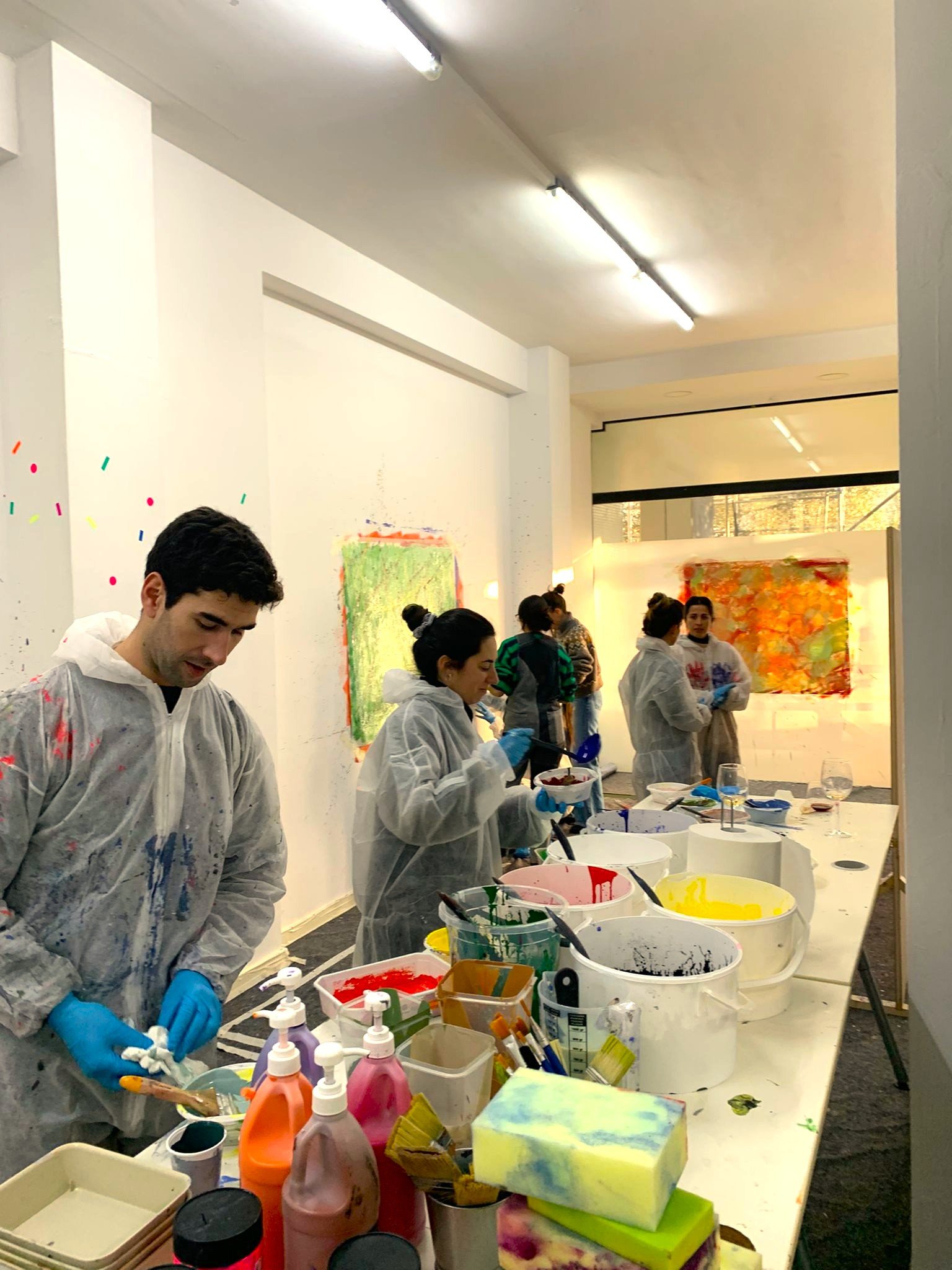 Workshop de action painting no Porto que oferece uma experiência criativa imersiva de 2 a 3 horas num ambiente descontraído com orientação de um monitor com formação em artes visuais, fornecendo uma tela de grande formato (130x110cm), todas as tintas necessárias e equipamento de proteção permitindo que os participantes explorem as cores, os gestos e o movimento através da pintura livre e desinibida, criando obras de arte pessoais para levar para casa. Descobre a action painting como a abordagem mais fisicamente dinâmica do Expressionismo Abstrato, iniciada por Jackson Pollock e outros artistas de meados do século XX que enfatizavam a criação espontânea de marcas gestuais, o movimento corporal e o processo de aplicação de tinta em vez de imagens representativas.
