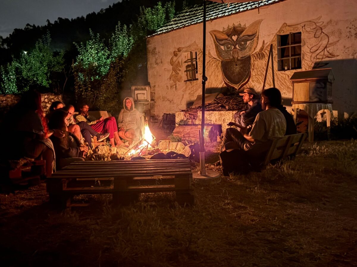 Sessões nocturnas à fogueira com música, narração de histórias e interação comunitária