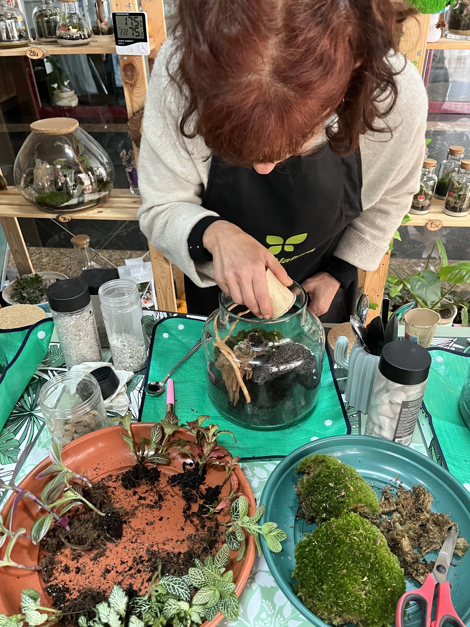 Seleção e colocação de plantas: Identifica espécies que prosperam em ambientes fechados de elevada humidade, como fetos, musgos e folhagens tropicais que requerem condições de humidade e luz semelhantes, tomando decisões criativas sobre a disposição das plantas, equilibrando a composição estética da paisagem em miniatura com espaço de crescimento adequado.