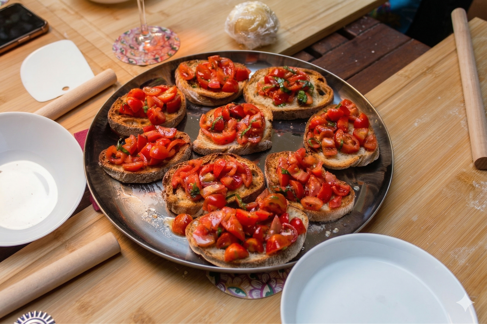 Bruschetta fresca com tomate cereja enquanto a massa descansa