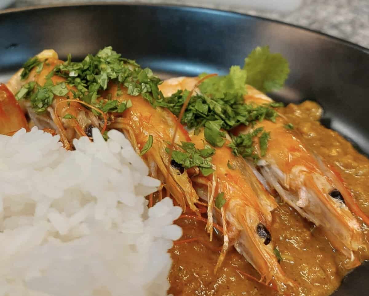 Principal: Caril de camarão de Goa - O clássico costeiro com coco, tamarindo e misturas de especiarias distintas
