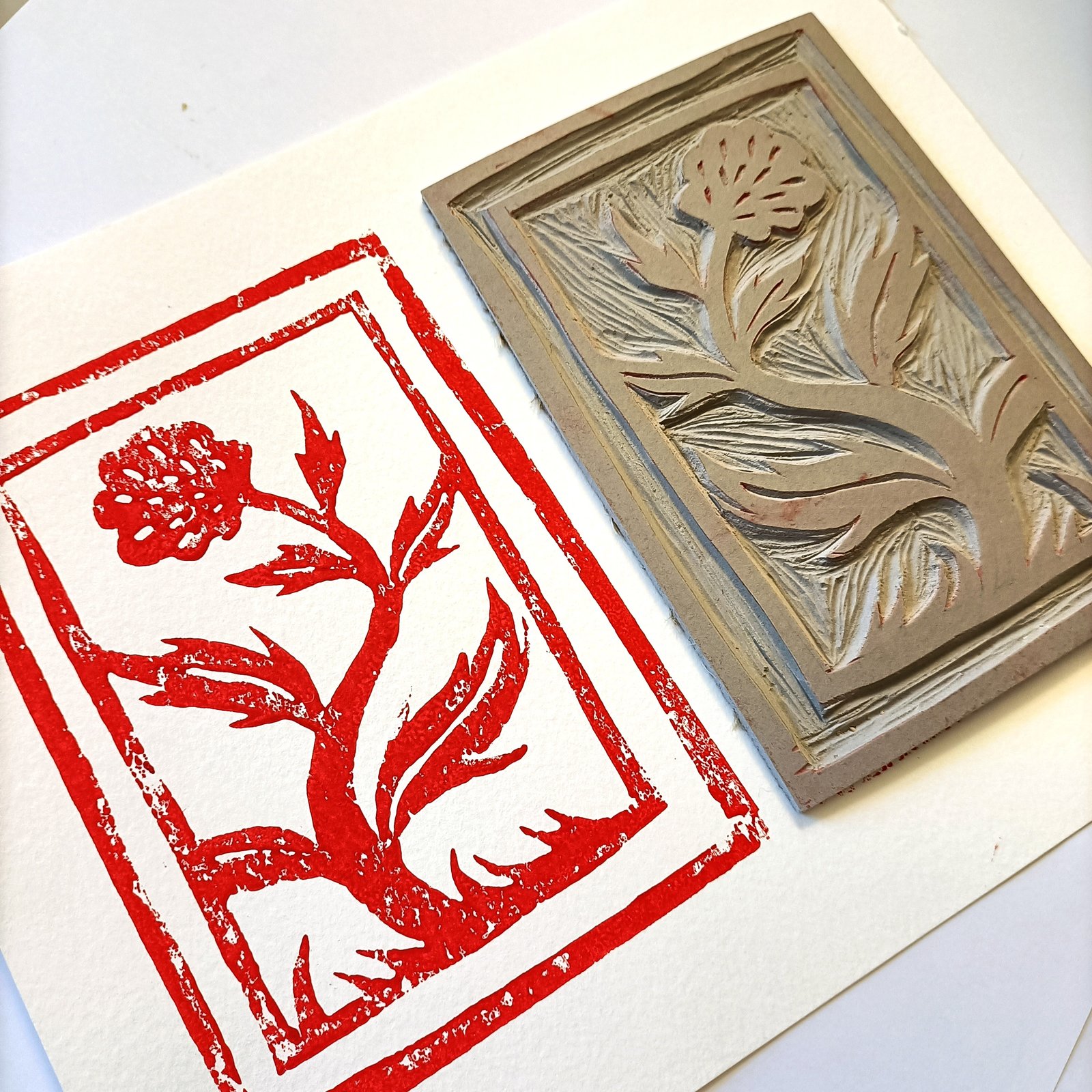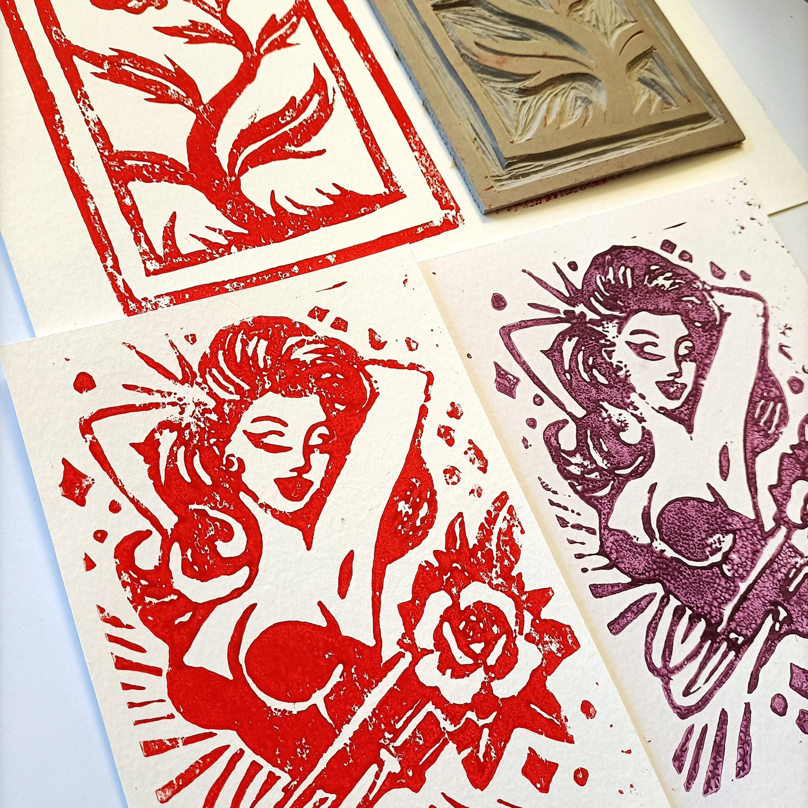 O teu bloco de linóleo esculpido e um conjunto de impressões acabadas a partir do teu próprio desenho original, pronto para emoldurar ou usar como ponto de partida para uma prática de gravura em casa.