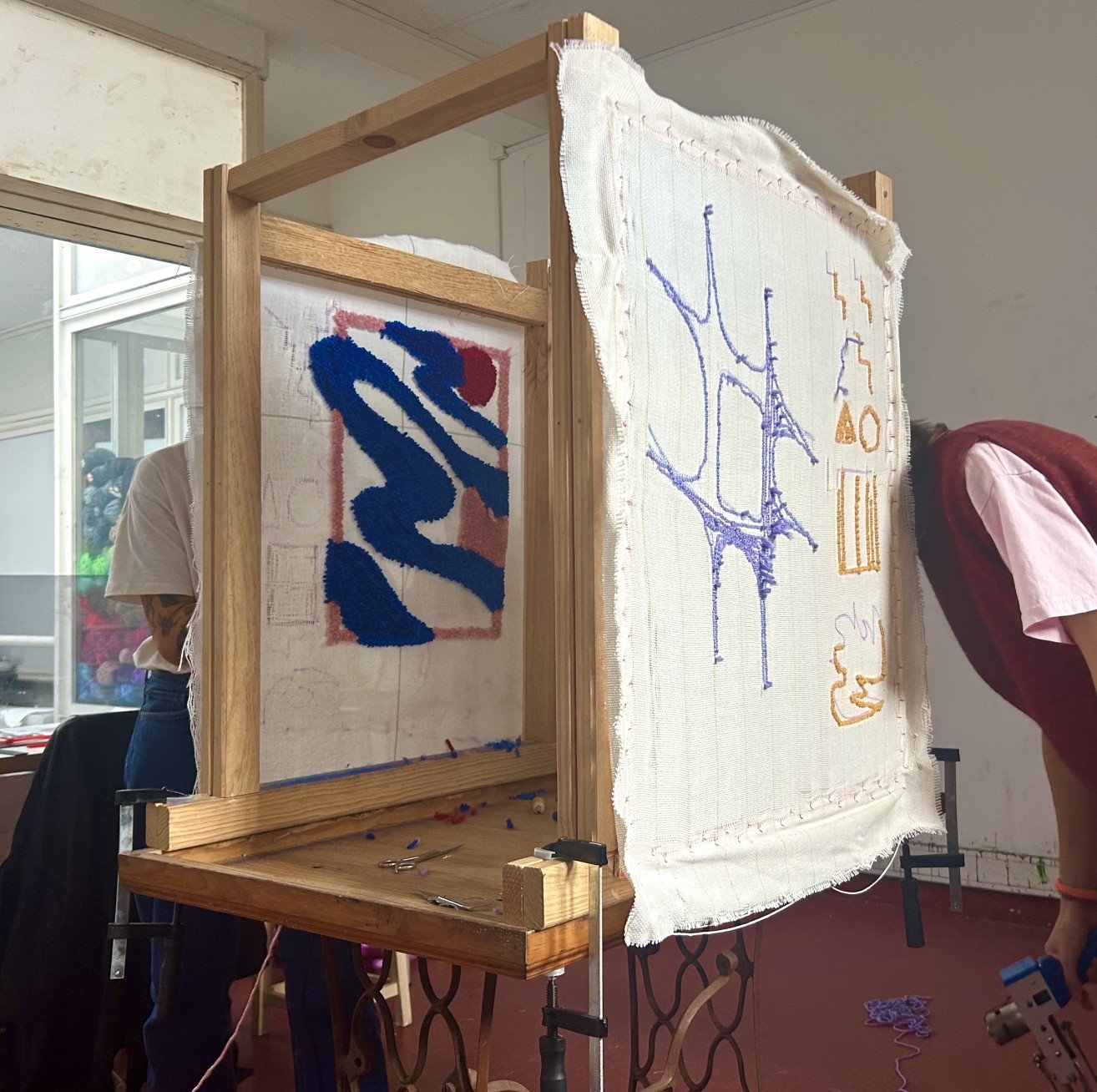 Abordamos todo o processo de tufagem do início ao fim. Começa com as noções básicas de agulha de punção e ferramentas manuais antes de passar a uma introdução às máquinas de tufagem eléctrica AK-I cut pile e AK-II loop pile. Depois de preparares os teus materiais e aprenderes a utilizar a pistola, passamos à demonstração prática e aos exercícios, traçando o teu desenho na moldura e trabalhando o método de tufagem ao teu próprio ritmo. A sessão termina com o processo de acabamento, em que a tua peça se torna um trabalho têxtil completo, pronto a levar para casa. O suporte é aplicado após a sessão e as peças acabadas são enviadas no prazo de uma semana.