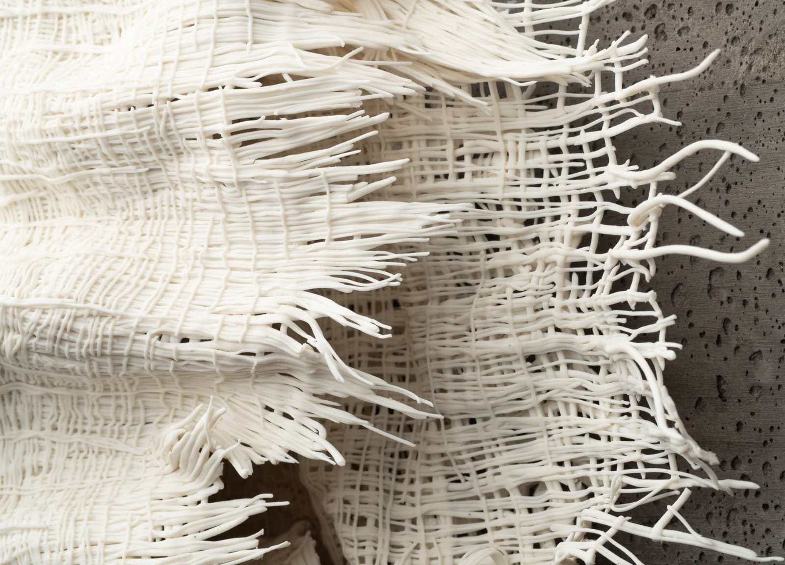 Cerâmica inspirada nos têxteis: Cria padrões delicados em forma de renda em porcelana, onde pequenas bobinas se cruzam formando telas tecidas. Explora a forma como a cerâmica pode captar a qualidade efémera dos têxteis através de transformação projectada.