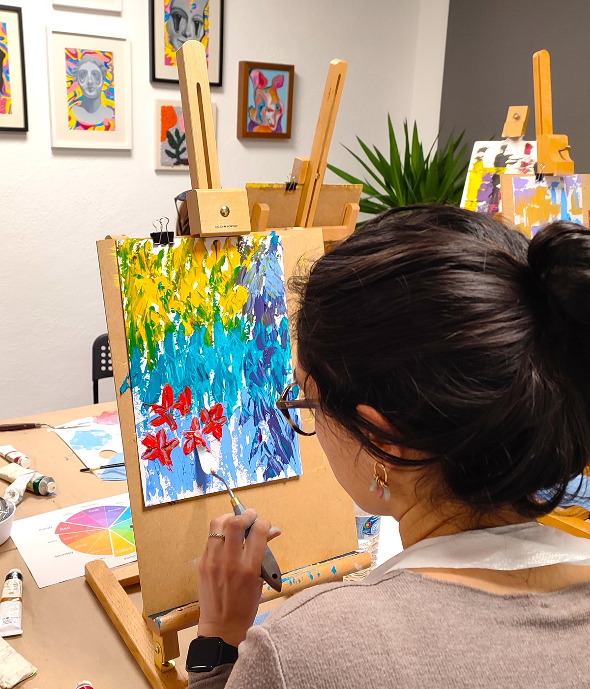 With the guidance of our artist, you will learn how to paint an abstract masterpiece in the oil painting technique. You will explore how to paint with oil colors just by using the palette knives.